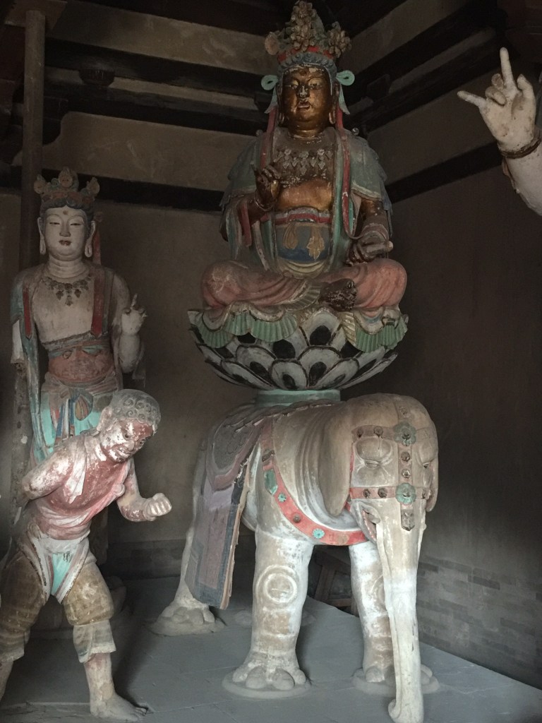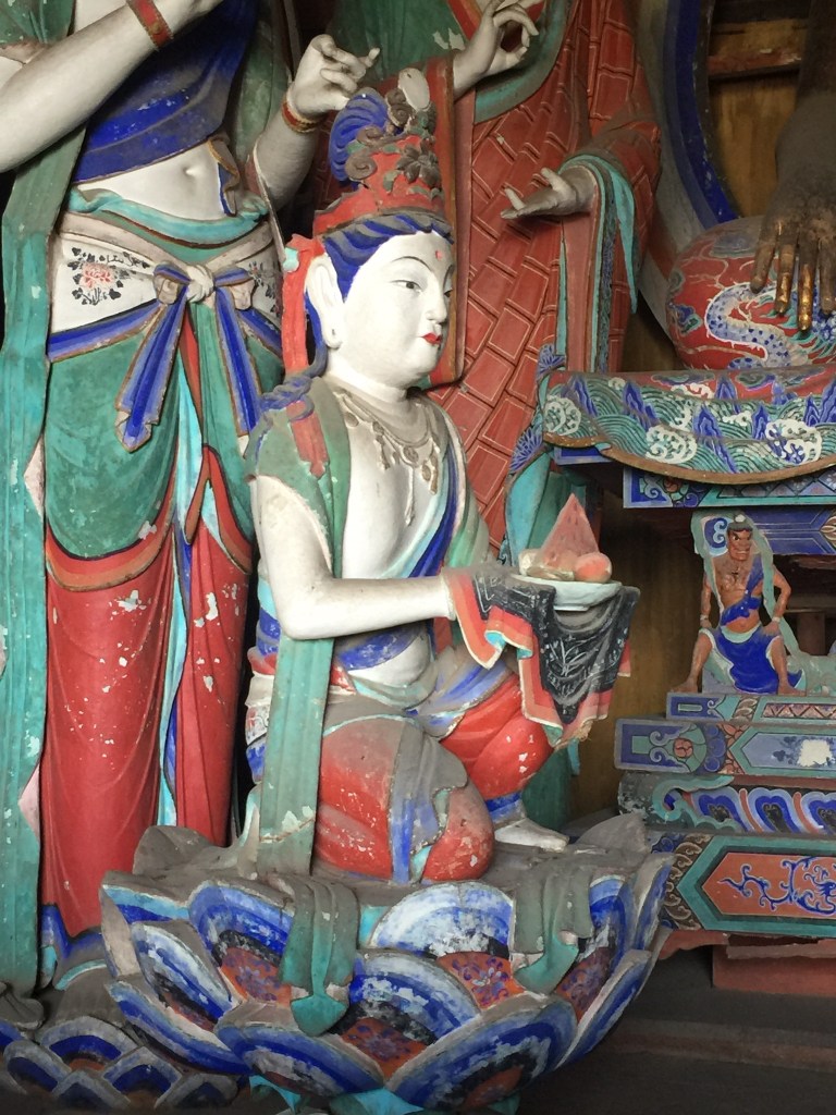 中唐以後,菩薩立像都微微向前傾,腰部微彎曲,腹部微凸。臉部飽滿,眉毛優雅地彎曲,不像前一時期那樣過分,很自然地呈弧形勾畫出天庭。眉弓下不再有凹溝。眼睛上皮更寬,眉下的曲面減窄。鼻子稍短也稍低。鼻端與咀稍近,嘴唇更有表情,額頭高度稍減。裝飾沒有那麼華麗,頭巾簡化,高髻。服裝更合身,仍然有珠串,但桂著的飾物減少了。 供養菩薩都是一足蹲着一足跪着,在高大的蓮座上。 佛光寺內便有典型例子。這裏菩薩都有披肩,左右長髮下垂。內衣從左肩垂下,用帶子系結在胸前。腰部以下,用帶子束長裙,帶子在臍下打成結。觀音衣飾最特殊,在胸前作如意頭,兩乳作成螺旋紋,雲頭覆在肩上,兩袖翻卷作火焰形。