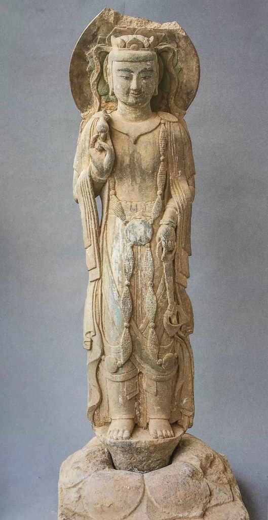 單體菩薩像,左手通常執蓮花或蓮蕾,因此被視為觀音菩薩。