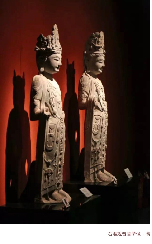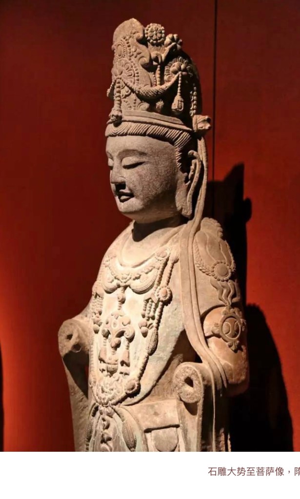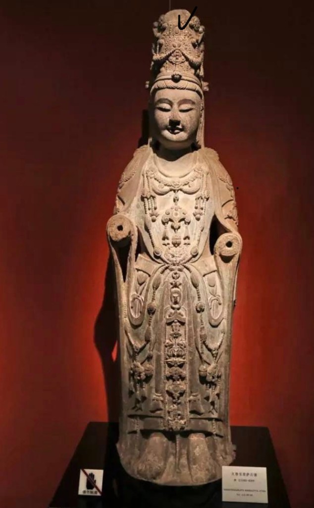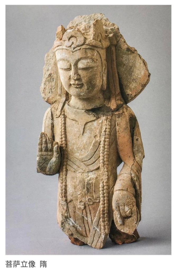 隋的菩薩,服飾變得華麗,頭巾和項鏈嵌着鬟石般的裝飾,珠鏈從肩上垂下,間隔地掛着飾物,抵到膝部以下。