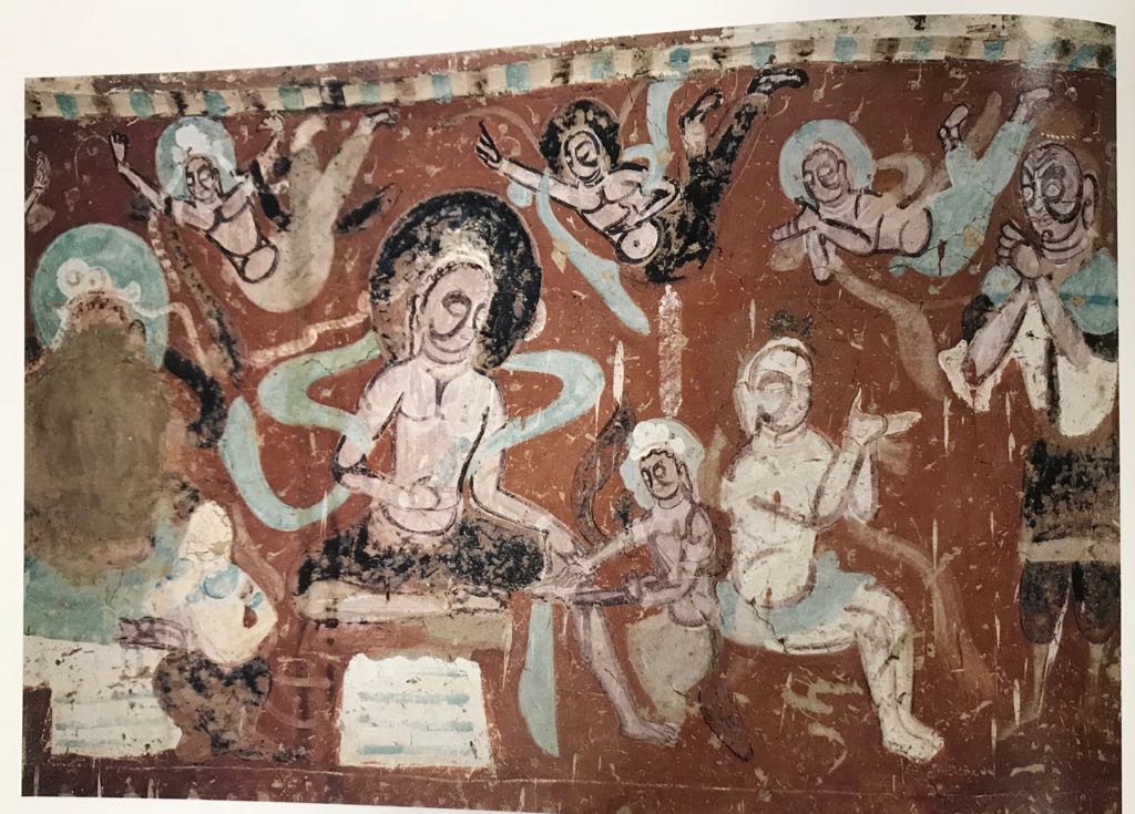 佛教石窟壁画中的飞天主要是指能歌善舞的伎乐天,是乐神乾闼婆和歌舞神紧那罗的化身,服侍帝释天专管奏乐演唱的天龙八部众之神。乾闼婆和紧那罗原是古印度神话中的歌舞神和娱乐神,是一对夫妻,乾闼婆 Gandhara 又称为香神,是一种不吃酒肉,只寻香气作为滋养全身散发香气的神, 另一説法是醜陋多毛,鬈髮,半人半獸,執武器,飛行於天中,守護蘇摩。“乾闼婆”在梵语里意为变幻莫测的天歌神,“紧那罗” Kipnara 意为天乐神,夫妻两皆善于歌舞音乐,在佛教造像中往往不分男女,夫妻一体,兼具男性的阳刚和女性的阴柔之美。在印度早期的壁画中飞天就已出现,中国自东汉末年随着佛教的传入,在中国队石窟雕塑和壁画中都有大量的飞天形象。敦煌石窟的飞天西域风格明显,是佛教传入中国早期飞天形象的代表,魏晋嫩北朝时期,中国佛教石窟寺庙中的飞天由印度歌舞形象与道教的羽人、天仙相结合形成了中国特色的飞天。