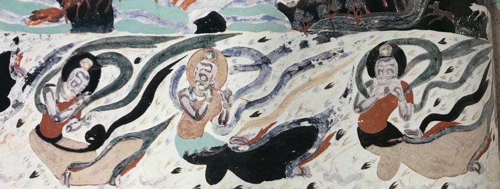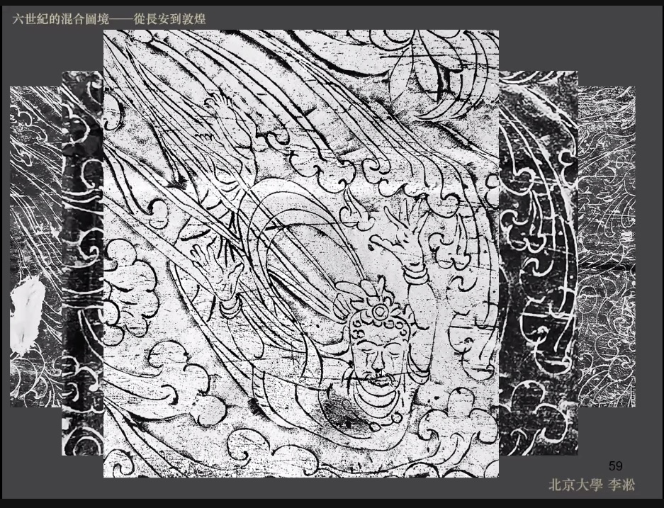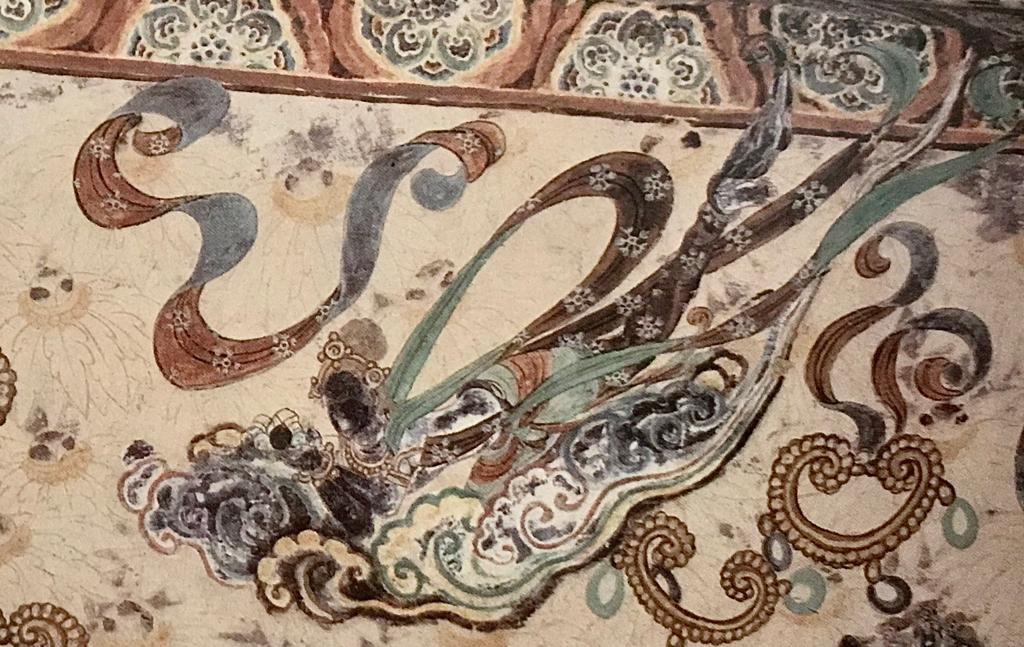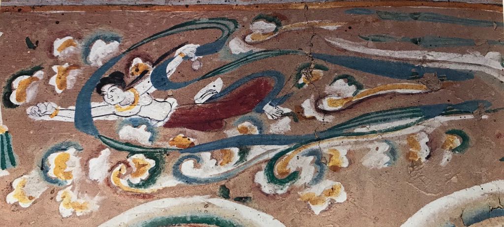 敦煌的飛天始於十六國如275窟(北涼),屬早期飛天,面圓,身肢較粗壯,身體曲折成V型。身下無雲朵。之後北魏飛天身體修長下穿裙,其下不大見雲朵。西魏、北周。飛天的飛動感很強,四周有流動的雲氣。西魏飛天受中原風格影響,其旁的雲氣是繼承漢代的雲氣紋,有動感,但比中原的纖細和分散(如285窟)。北周亦然。至隋代,其下的雲朵呈現,雲朵相連。唐已經成大朵的如意雲頭兼有尾巴,飛天已是乘在云朵之上。