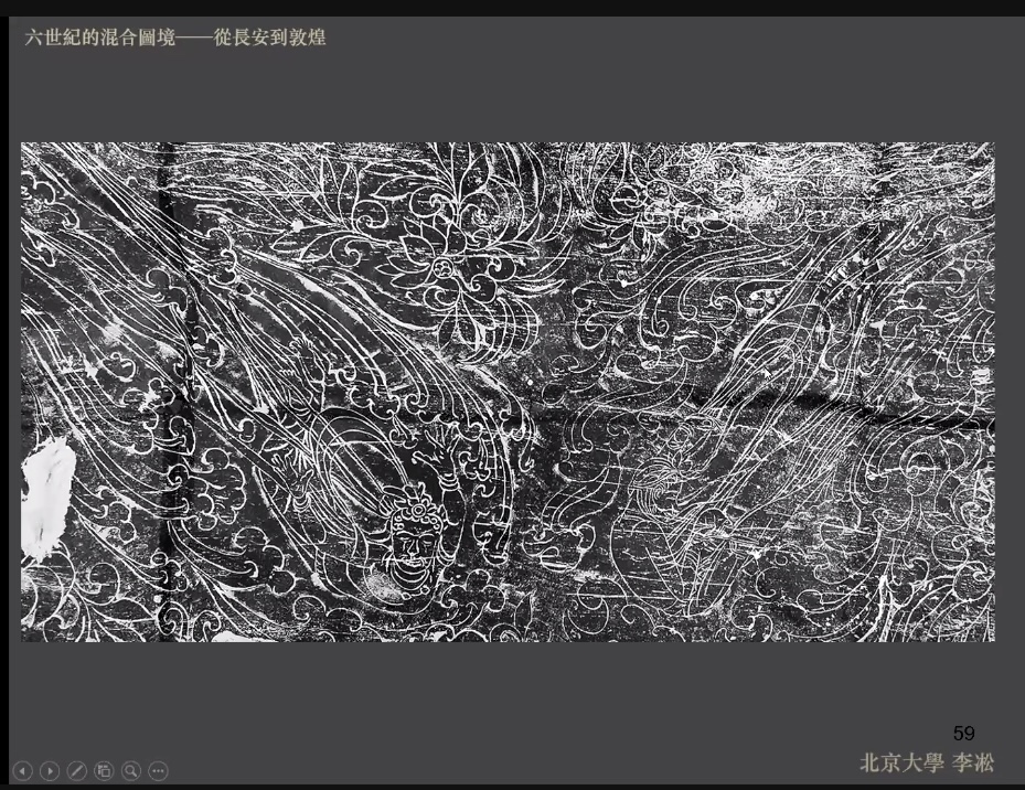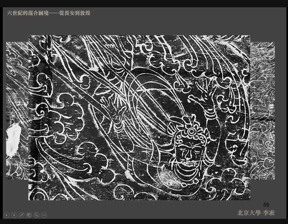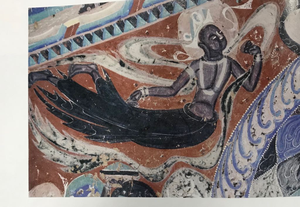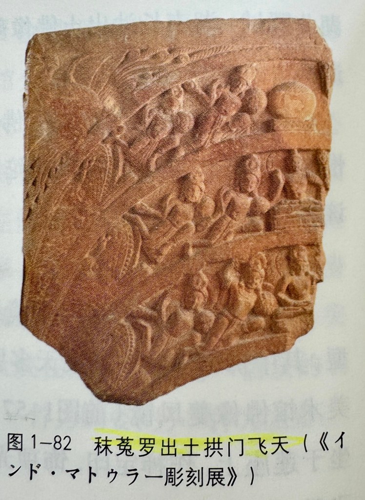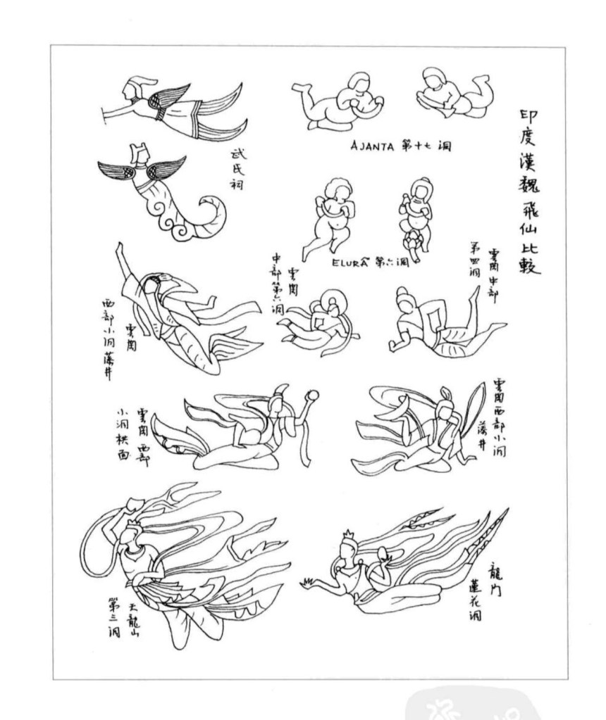 梁思成雲岡石窟飛天 分兩派:一為摹仿印度,一為創造。前者着印度濕褶的衣裳而露腳,後者着短裳曳長裙而不露腳,裙末在腳下纏繞後,復張開飄揚的。前者肥笨而不自然,後者輕靈飄逸,表現出乘風羽化韻致,尤其是開展的裙裾及肩臂上的飄帶,生動有力,給人以回翔浮蕩之印象。j