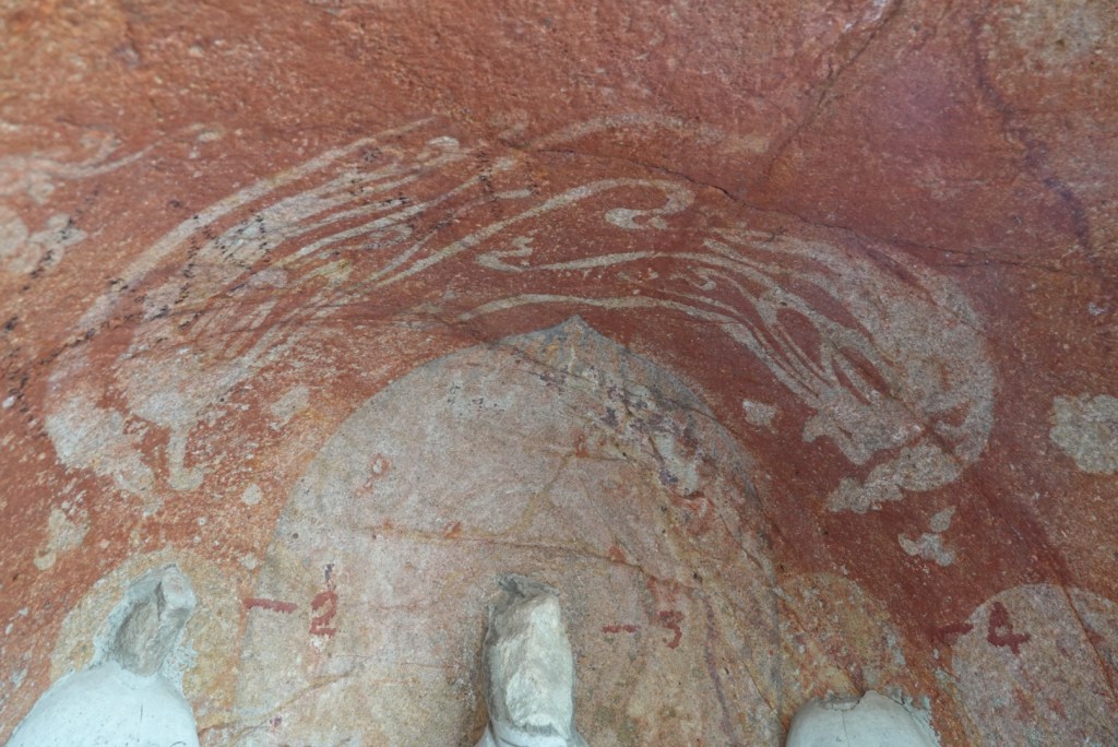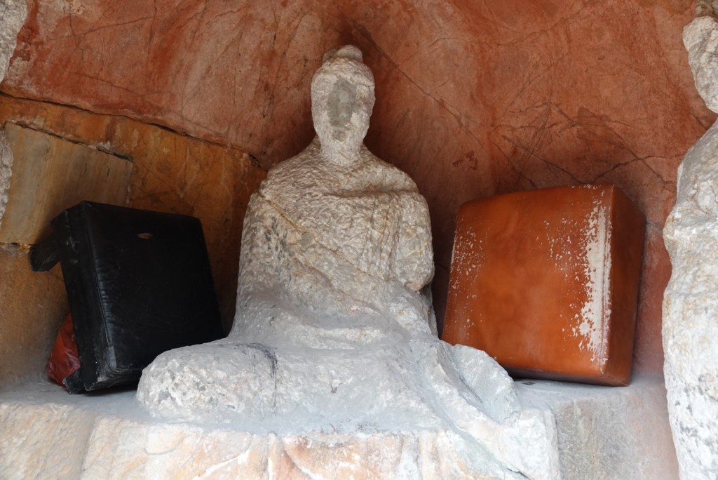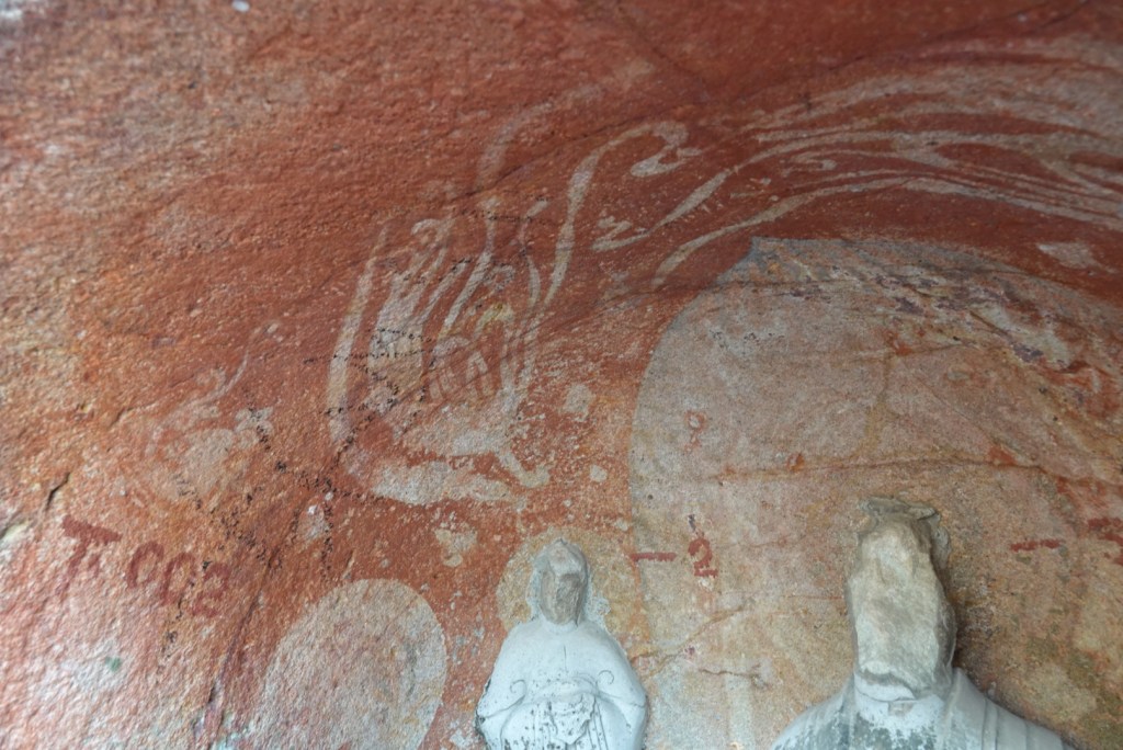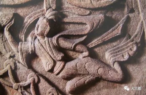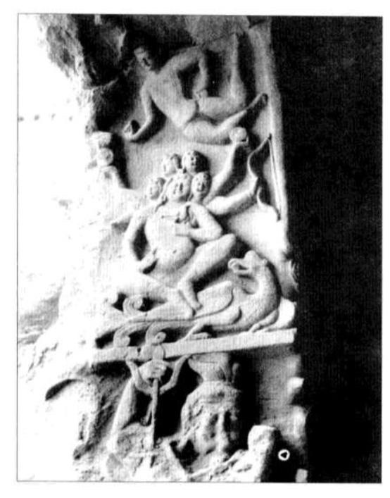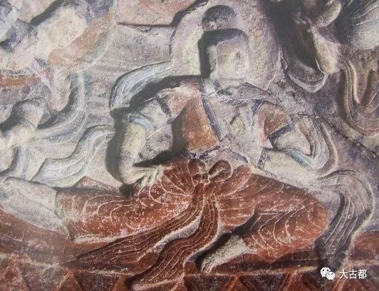 早期大像窟中的飞天较少,多雕凿于佛和胁侍菩萨的头光、背光和龛楣上,以装饰花纹的形式出现。体态丰满,面向浑圆,身体结实,呈蹲坐状,“飞翔”的感觉并不明显。