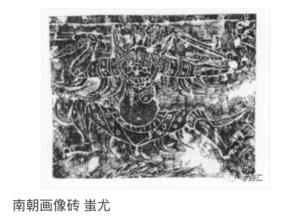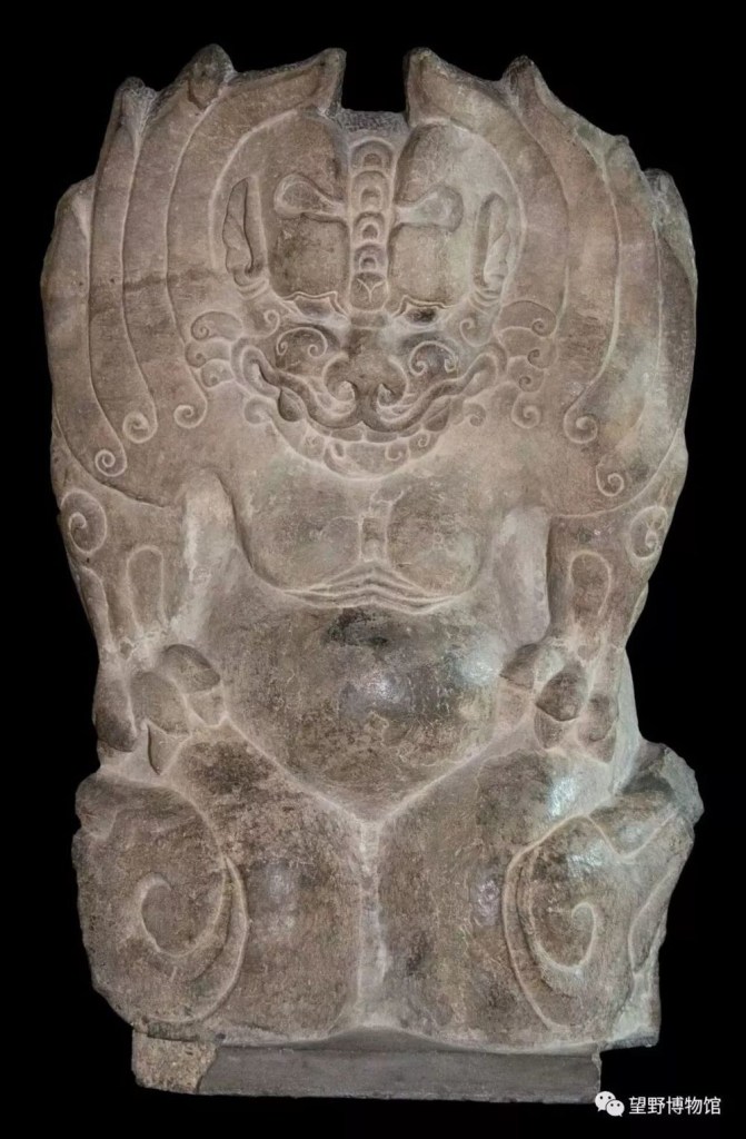 山海经》神怪图像中,有一个始终存在的经典“人物”——蚩尤。《山海经·大荒北经》说蚩尤作兵攻伐黄帝,黄帝令应龙迎战,双方在冀州之野大战,蚩尤兵败被杀。这个失败的战神,在古代丧葬仪式中常请它来镇守墓穴。蚩尤在汉画像石的形象,全副武装,凶猛狰狞。越两晋到南北朝时,肩部似乎出现火焰,四肢生出飞羽,武器减少,逐渐有了稍后“畏兽”的模样。到南北朝晚期,明显明确可判定为蚩尤的图像消失了,类似蚩尤的“畏兽”大量出现。