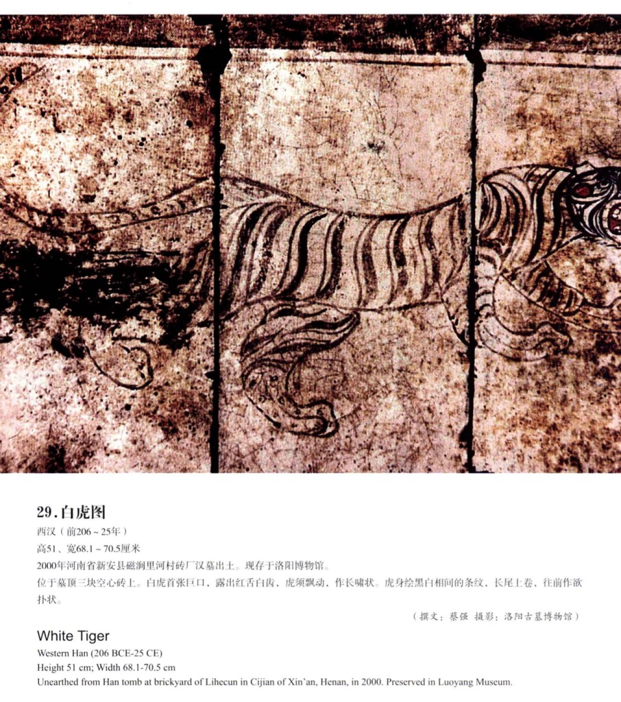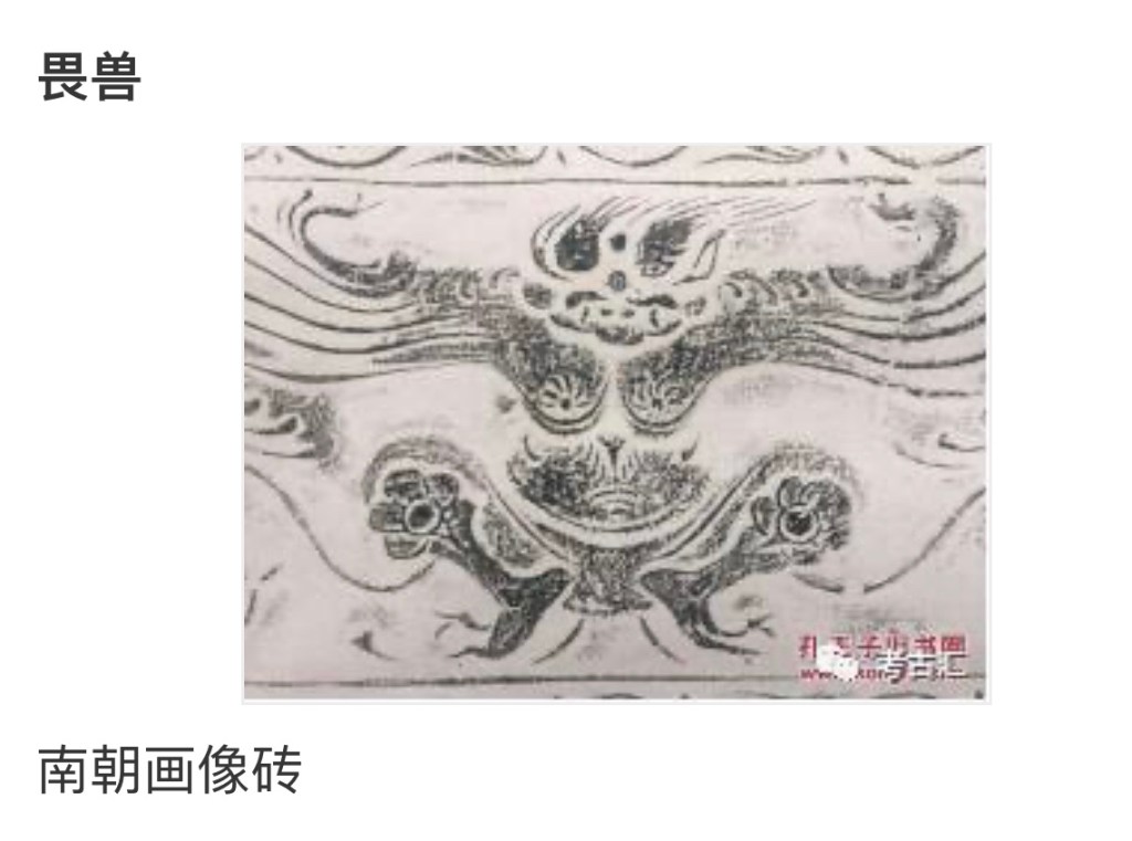 畏獸形象源流 漢代流行儺戲,大家儺之禮,後漢書:先臘一日(臘月初七),大儺,謂之逐疫。大儺另一名逐疫。 其儀:選黃門子弟(官宦家小孩)10-20 歲,120人為侲子。侲:打鬼時用振動的武器嚇鬼。皆赤幘(紅頭巾),皂制(深灰色衣裳),執大淺(似貨郎鼓)。 方相氏(打鬼的头目)黄金四目(一种假面),蒙熊皮(披熊皮),玄衣朱裳(黑色上衣红色裙子),执戈扬盾(戈为出击,盾为防卫)。十二兽(吃鬼的十二神兽,由人装扮)有衣毛角(穿兽皮戴兽角)。中黄门行之(由宦者带领他们行进),冗从仆射将之(由侍卫率领),以逐恶鬼于禁中。……凡使十二神(即十二神兽)追恶凶!……因作方相与十二兽舞,欢呼周遍,前后省三过(围绕宫殿前后巡视搜索三次)。