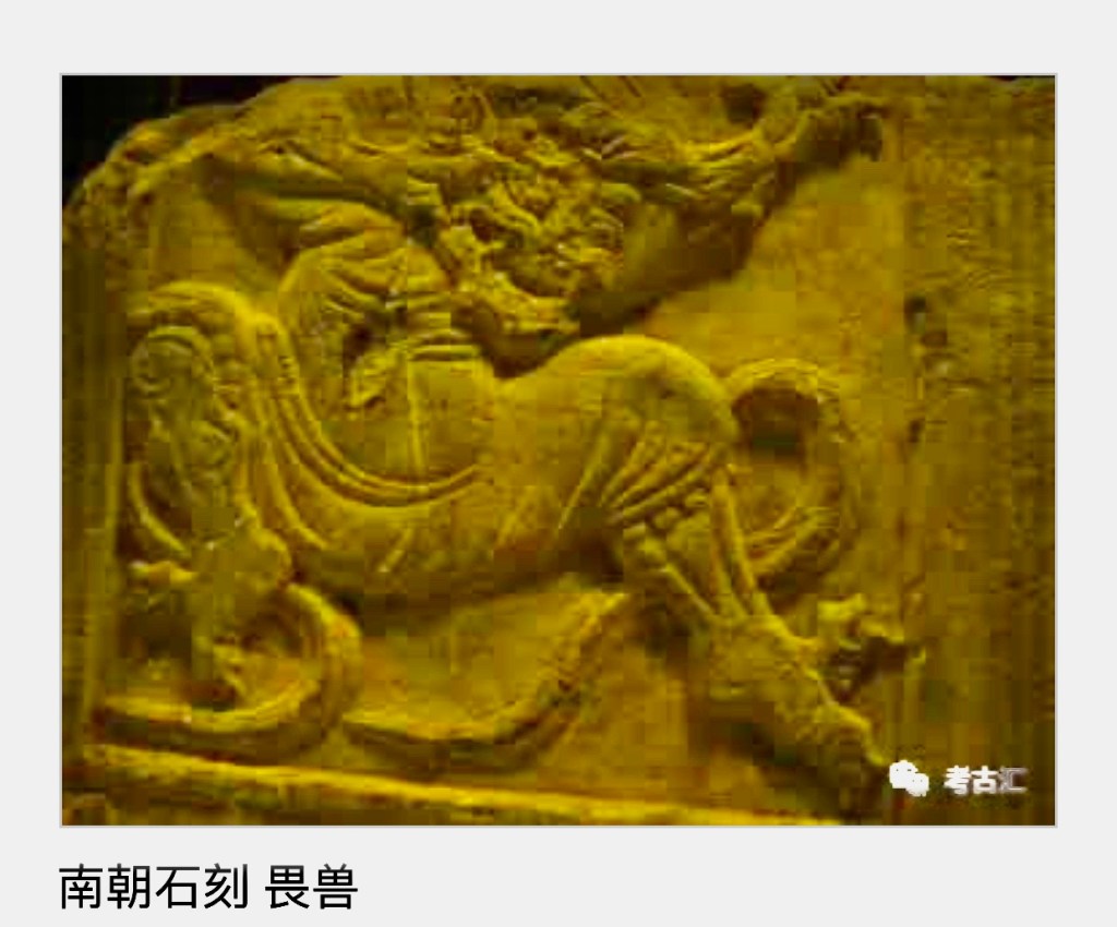 畏獸。 流行於南北朝,最早見於東漢建安十六年 (211),最晩是唐天寶三年 (744) 最早出於東大街晉郭璞山海經注: 善投擲 食虎豹,御兵 辟兇邪氣 虎首人身,四蹄長肘,又曰強良 所以其實是形象不一。 達微注的(故宮博物院藏河北响堂山北齊右畏獸考)中定義北响堂山神獸形象為畏獸