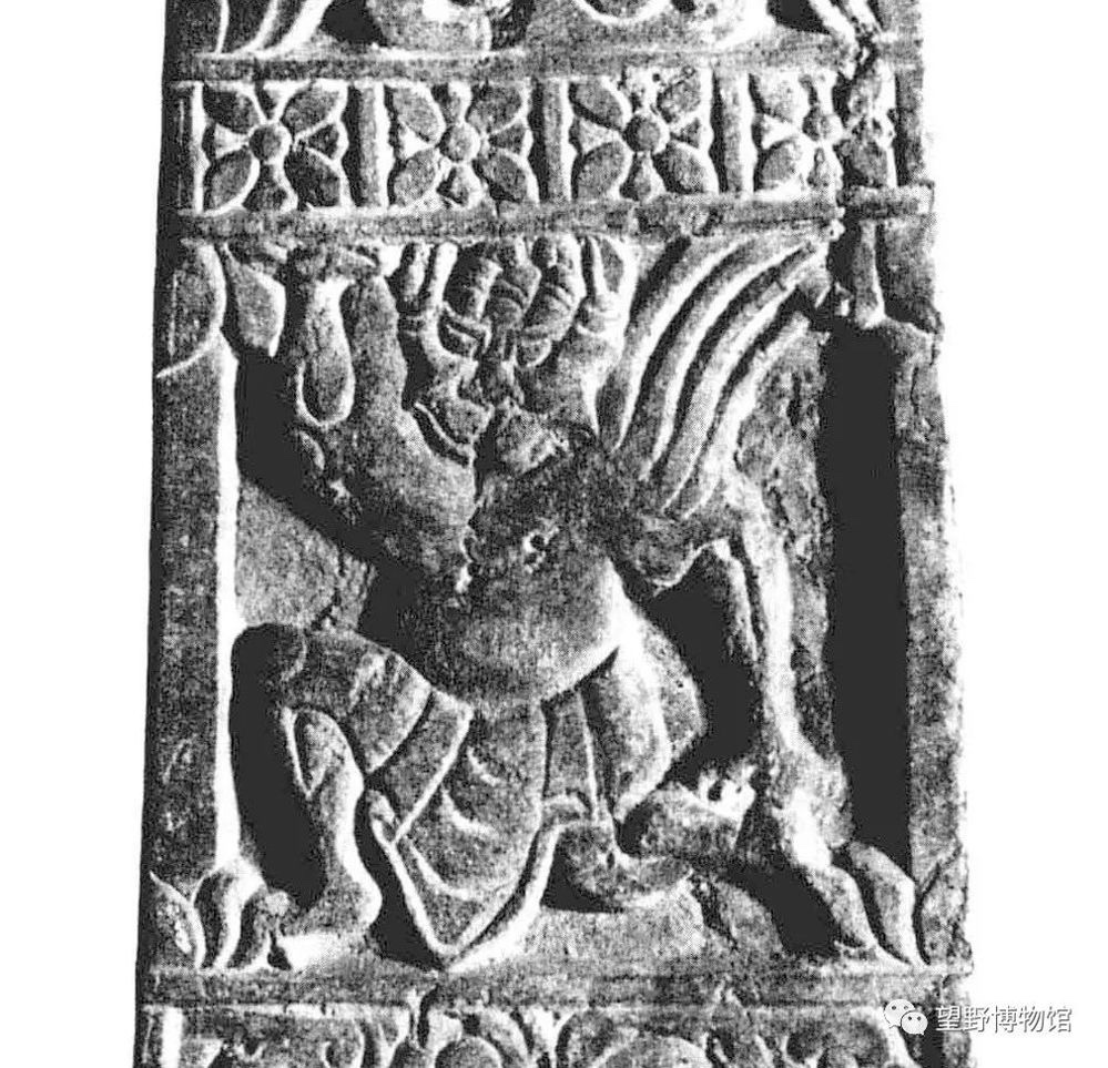 再看此处的方相氏形象,其已经渐渐与前期的方相氏形象有所变化,其身材显得更加健硕魁梧,其人的意味在减弱,而兽的意味明显增强。经过这种转变,其形象与北朝时期的畏兽形象已经非常接近了。此例中的方相氏,笔者认为他已经可称为畏兽形象的雏形了。