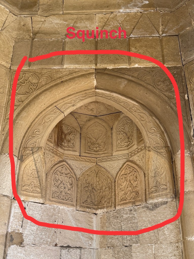 To fit a circular dome on a square building we need pendentives, so pendentives are triangles that go around the corners of a square room. Squinches are arch-like structures that go around the corners and make a dome shape. Both are designed to spread the weight of the dome to the wall