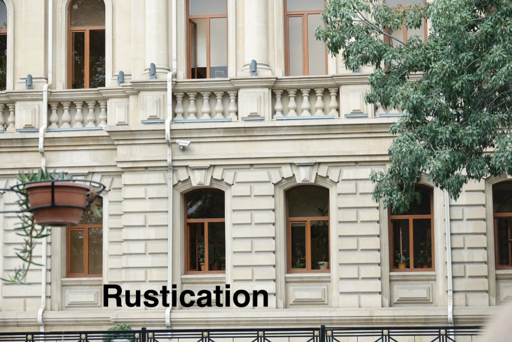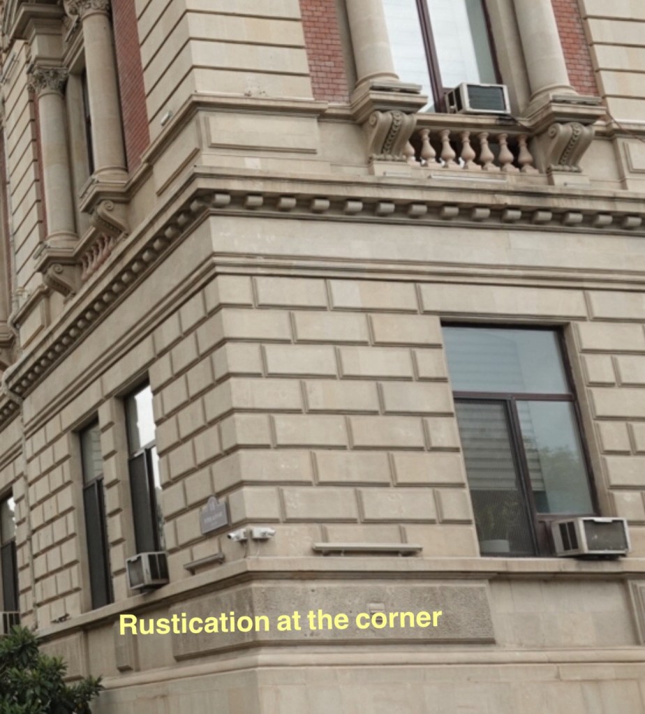Rustication: trimming of the edges of the stone plate to make the main body stand out. At the corners we see only a single stone plate.