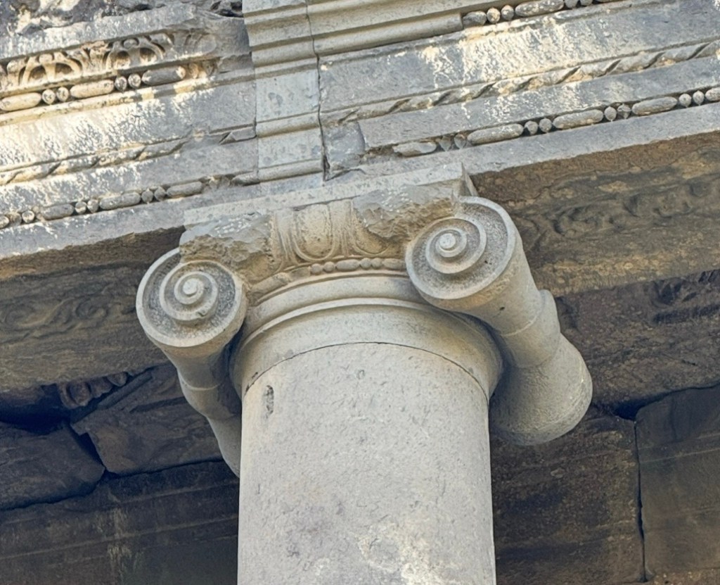 The Greek temple we saw has 6 pillars in the front (where we saw the Pediment). Number of pillars at the front can be 4,6,and 8. The pillars number at the side varies. They are Ionic pillars which can be recognised by the characteristics capital.