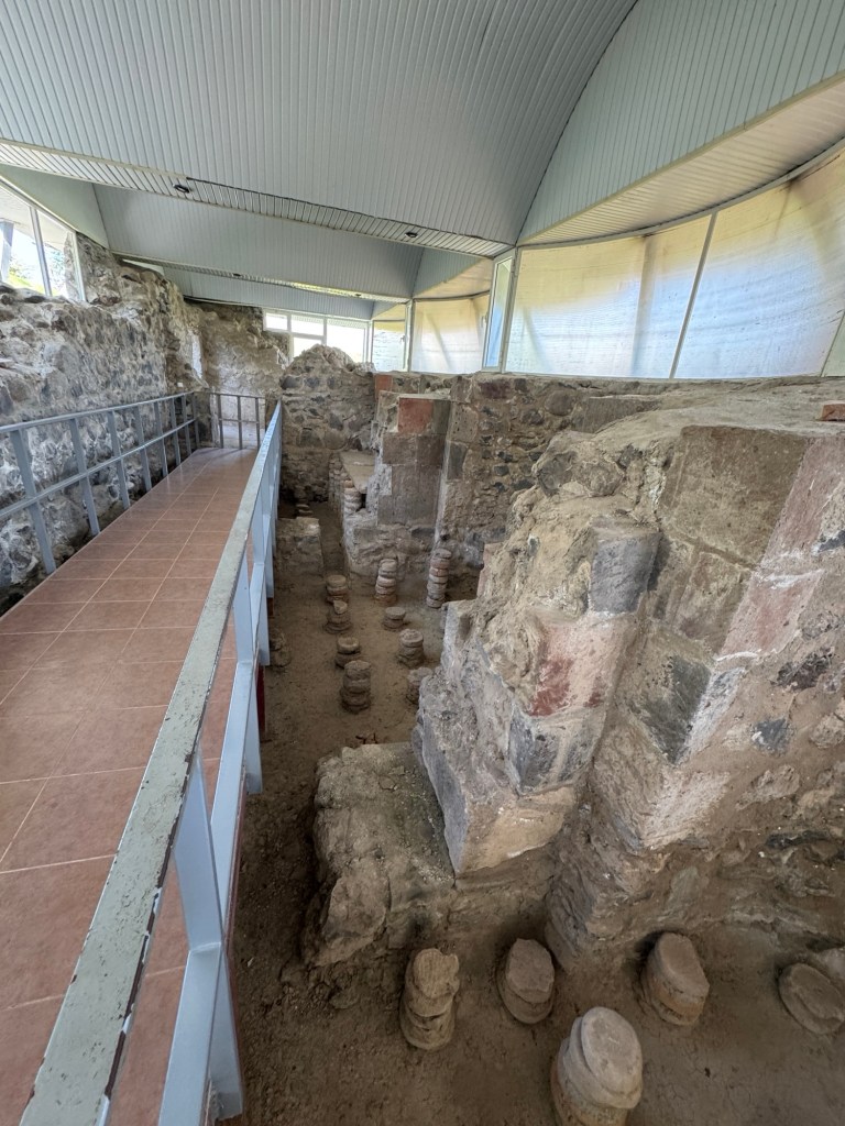 Thermal mass. The bath we saw near the Greek temple had water heated from one side and then flow to the other side. Beneath the floor were stacks of clay cakes made into pillars for support. They also have a high thermal mass to absorb heat. The bath closer to the hot water source is hottest while the furthest end is coolest, so there is a choice for different temperatures.